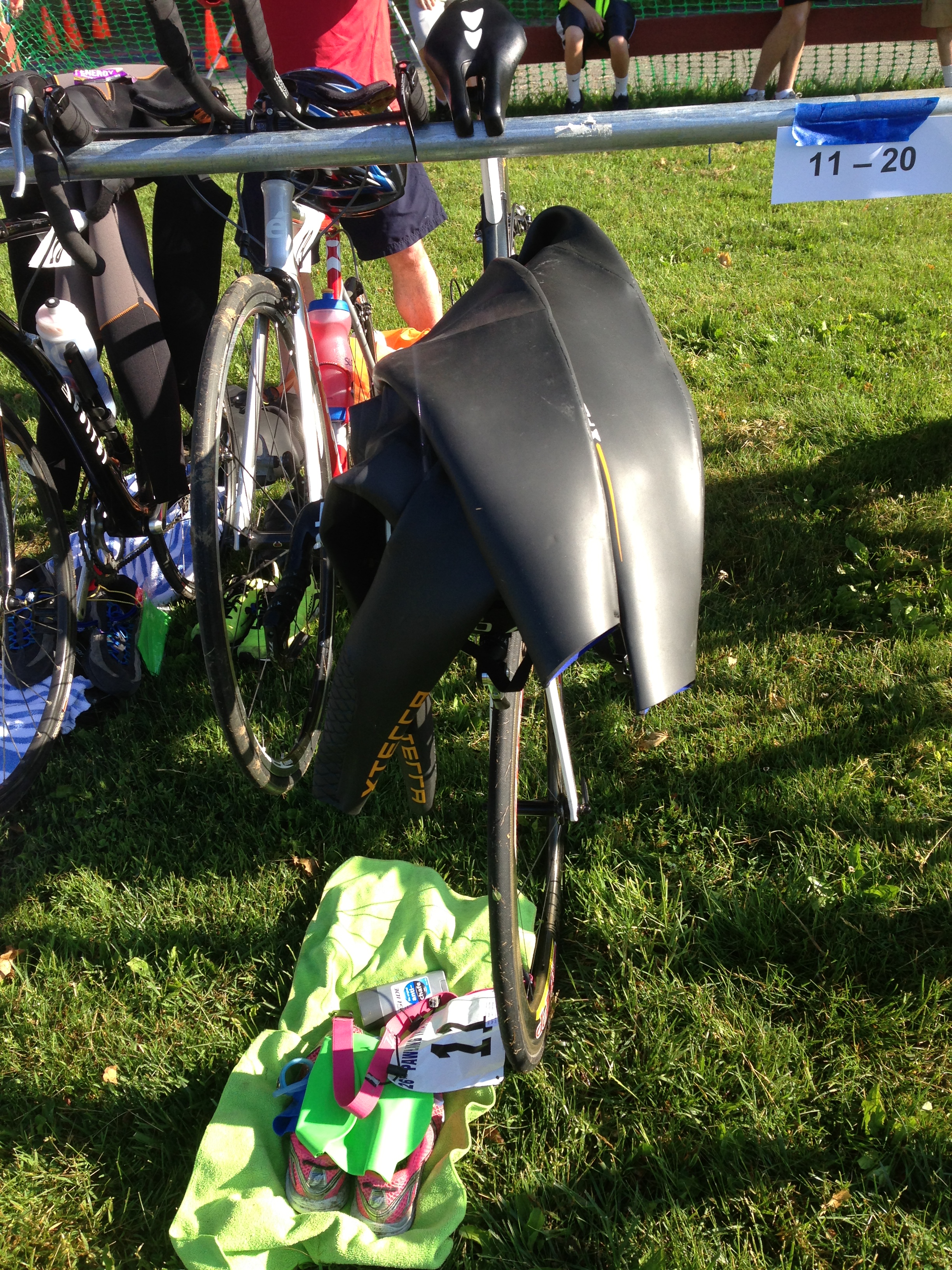 swim was only 0.3 of a mile, since this was a sprint triathlon, but the buoy looked as though it was a mile out in the middle of the lake. I had played out the swim in my mind zillions of times before the race… But new issues arose, such as: when do I put on my wetsuit? and, when should I put my race belt on? Before I knew it it was time to suit up, all I could think was, “It’s so freaking hot, and I’m sweating, how am I supposed to get this on?”