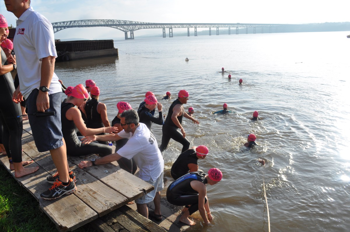 Entering the Hudson River for the swim start.